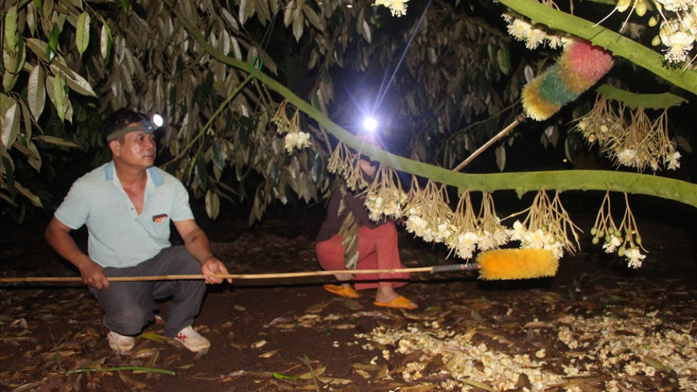 Đây là biện pháp cho hiệu quả cao nhất trong điều kiện thiếu tác nhân tự nhiên. Thời điểm tốt nhất để thụ phấn là từ 20–22 giờ khi hoa nở rộ và nhị đang tung phấn mạnh.