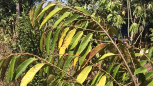 Hiện tượng lá sầu riêng vàng cháy, khô mép, loang mảng xuất hiện khá phổ...